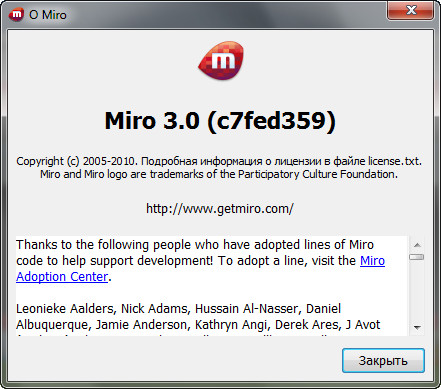 Miro - медиаплеер, основное предназначение которого - облегчение просмотра видео в Интернете. Плеер позволяет подключаться к видео-каналам, загружать видео-файлы на компьютер, просматривать ролики в полноэкранном режиме и т.д. Miro прост в работе и абсолютно бесплатен. Смотрите практически любое видео - Quicktime, WMV, MPEG, AVI, XVID и другие форматы. Просматривайте свою коллекцию, делайте плейлисты, сохраняйте порядок. Подписывайтесь на любые потоки RSS, содержащие видео, подкасты или видеоблоги. Исследуйте сотни свободных каналов при помощи встроенной программы передач.