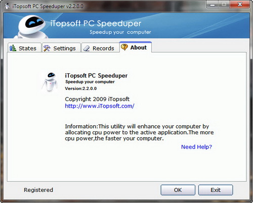 ITopsoft PC Speeduper increases computer performance by allocating higher portions of CPU power to active applications and games.It is a revolutionary product which enhances processor intensive software to run at even faster speeds. Very easy to use, fully compliant with all versions of Microsoft ?Windows and compatible with most software. With ITopsoft PC Speeduper your computer will run faster than ever before. Boost the performance of your PC the easy way remarkably.