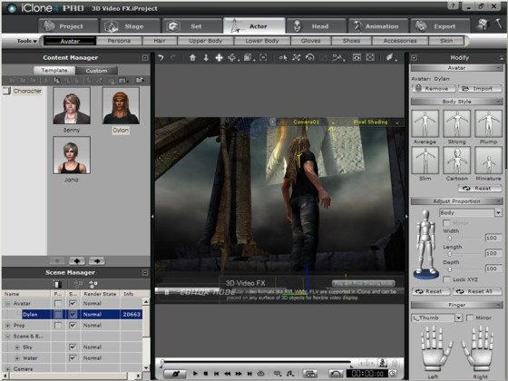iClone - программа для легкого создания трехмерной анимации. В программе уже имеются готовые 3D-персонажи и все необходимое для создания их виртуального мира — одежда, реквизит, ландшафты. Присутствует и большая библиотека движений, которые можно присваивать персонажам. Интересной особенностью программы является возможность использования для лиц ваших трехмерных персонажей фотографии реальных людей. Для этого используется технология FaceTrix, превращающая фотографию в 3D-объект. Программа хорошо взаимодействует с редакторами 2D-графики, благодаря чему можно легко и просто редактировать текстуры. iClone также поддерживает программы 3ds Max или Maya, с помощью которых можно создавать элементы библиотеки для персонажей. Все сцены программа позволяет визуализировать в реальном времени с учетом рельефа, отражений и прозрачности.