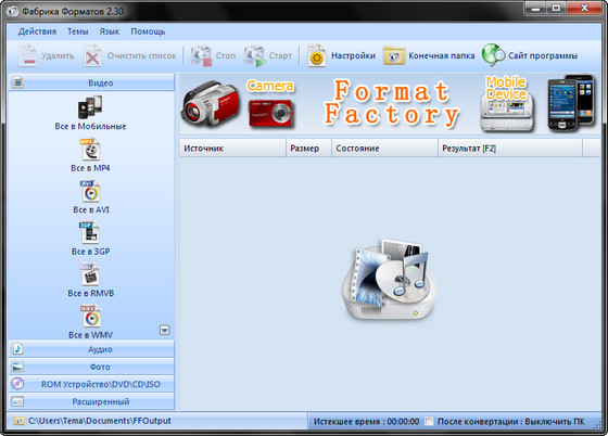 FormatFactory - многофункциональный конвертер различных файлов мультимедиа. Имеет рад дополнительных функций, превращающих FormatFactory в универсальный инструмент для работы с мультимедийными файлами разных форматов. Поддерживается конвертация популярных видеоформатов в MP4, 3GP, MPG, AVI, WMV, FLV, SWF, а также конвертация аудиоформатов в MP3, WMA, MMF, AMR, OGG, M4A, WAV. В FormatFactory есть функция преобразования изображений в форматы JPG, BMP, PNG, TIF, ICO, GIF, PCX, TGA. Среди дополнительных возможностей FormatFactory есть такие, как увеличение и вращение изображений, присвоение им тегов, а также восстановление поврежденных аудио и видеофайлов.