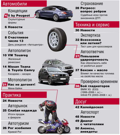 Еженедельное издание, полностью посвященное миру автомобилей. В издании представлено максимум информации о автомобилях и не только. Основные рубрики журнала: Автосалон, Автополигон, Концепции, Авторынок, Автобизнес, События и выставки, Практические технические и юридические советы, Спорт и другое.