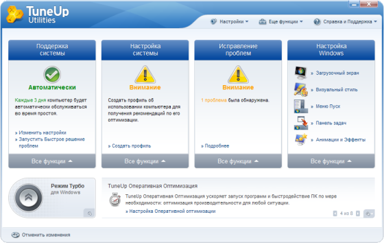 TuneUp Utilities были полностью обновлены: новое Главное окно является еще более легким для использования и обеспечивает еще более быстрый доступ к каждой функции.