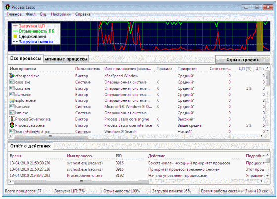 Process Lasso Pro - небольшая утилита, позволяющая вручную или автоматически манипулировать процессами, запущенными на вашем компьютере для достижения максимального быстродействия и стабильности. Эта утилита не является заменой стандартному менеджеру процессов, она, скорее, добавляет новые функции, которые позволяют оптимизировать работу ЦПУ при максимальной нагрузке. Программа дает возможность определить приоритет процессов, причем, по желанию пользователя приоритет будет задан и для всех последующих запусков. Также при помощи этой утилиты можно выполнить завершение работы нежелательных процессов. Кроме этого, программа позволяет вести статистику запущенных процессов. Программа имеет отдельную версию для 64-битных систем, а интерфейс программы обладает поддержкой русского языка.