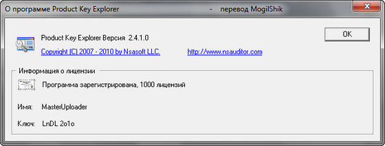 Product Key Explorer - позволяет расшифровать и увидеть, а также сохранить серийные номера (Product ID, Product Key, License Info, User Name, Company) продуктов Microsoft, CD-key установленных на компьютере программ, и не только их. Неполный список ПО, регистрационные данные которых можно увидеть и сохранить: Micrsoft Windows (2000, XP, 2003, Vista), Microsoft Office 2003, Microsoft Office 2007, Microsoft Office XP, Micrsoft Visual Studio 2005, Macromedia, Ahead Nero, Adobe Photoshop, CyberLink PowerDVD, Borland Delphi и т.д.