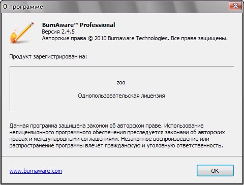 BurnAware Professional - относительно небольшая и простая в использовании программа для записи информации и музыкальных композиций на CD, DVD, Blu-Ray и HD-DVD диски, которая пригодится как опытным пользователям, так и новичкам. Программа поддерживает работу со всеми типа оптических дисков (включая CD-R/RW, DVD-R/RW, DVD+R/RW, BD-R/RE, HD-DVD-R/RW и DVD-RAM) и аппаратными устройствами записи. Утилита поддерживает создание образов, способна писать мультисессионные диски, имеет опцию проверки записанного содержимого, работает под операционными системами Windows 98/ME/NT/2000/XP/Vista/7 (32/64-bits).