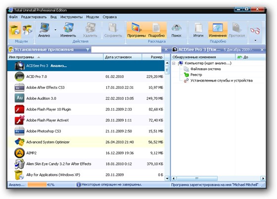 Total Uninstall - утилита, предназначенная для корректного удаления установленных программ. Первым этапом в работе Total Uninstall является слежение за изменениями в системе во время установки нового софта. Делается снимок файловой системы и реестра до начала установки того или иного приложения и после. В дальнейшем, исходя из собранных в момент установки программ данных (снимков до и после инсталляции), утилита быстро и безошибочно поможет удалить ненужную вам программу. Как видите, всё достаточно просто. В интерфейсе Total Uninstall нет перегруженности, все действия задаются через пошаговые диалоги. Резюмируя, можно сказать, что это полезнейшая утилита, если вы постоянно устанавливаете и сносите софт, а наличие в программе поддержки Русского языка упрощает работу с ней.