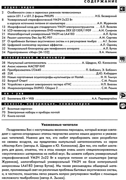 Основные разделы журнала: аудио, видео, электроника, компьютер, КВ и УКВ радиосвязь, современные телекоммуникации.