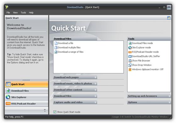 DownloadStudio - это универсальный комбайн для скачивания файлов и сайтов из Интернета. С ее помощью вы можете скачивать файлы в многопотоковом режиме, закачивать отдельные страницы или целые сайты для просмотра их в offline-режиме, а также осуществлять захват видеоизображения с экрана компьютера. Использование данной программы позволит вам отказаться от установки на компьютер программ, выполняющих все вышеперечисленные функции раздельно.