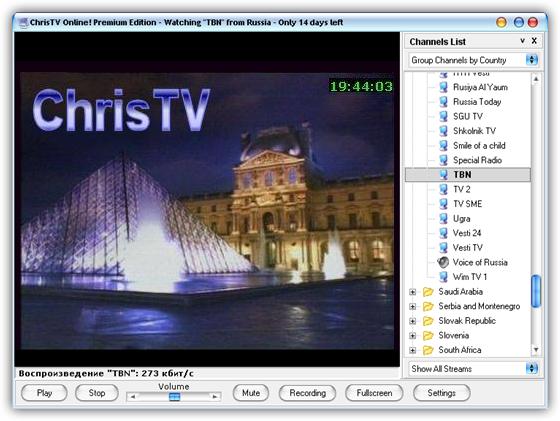 ChrisTV Online! Premium — позволяет просматривать и записывать огромное количество ТВ-каналов, радиостанций и другого аудио-видео материала, транслируемого через сеть интернет. Для всего этот используется только соединение с интернетом, и не нужно никакого дополнительного оборудования. В базе ChrisTV Online! Premium имеется более 1800+ телевизионных каналов и более 600 радиостанций из 100 стран мира. Выбор каналов можно производить по стране, типу, категории, языку, названию станции. У Вас также есть возможность добавить Ваши собственные радио/каналы база данных каналов.