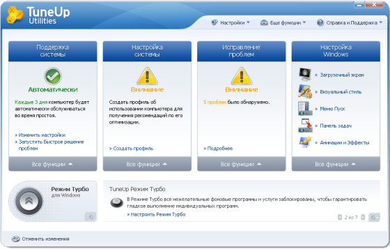 TuneUp Utilities были полностью обновлены: новое Главное окно является еще более легким для использования и обеспечивает еще более быстрый доступ к каждой функции.