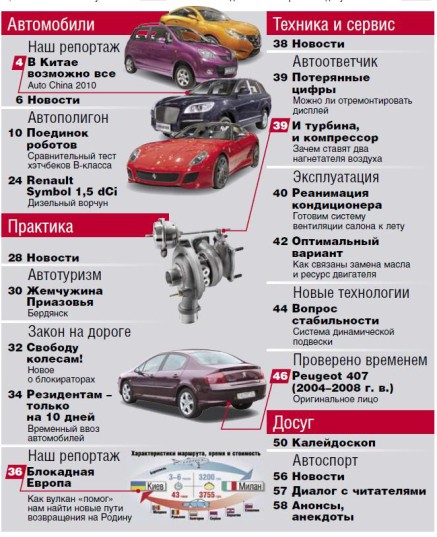 Еженедельное издание, полностью посвященное миру автомобилей. В издании представлено максимум информации о автомобилях и не только.Основные рубрики журнала: Автосалон, Автополигон, Концепции, Авторынок, Автобизнес, События и выставки, Практические технические и юридические советы, Спорт и другое.