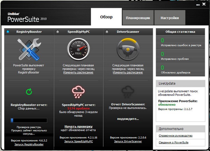 Uniblue PowerSuite 2010 - является полным решением для повышения производительности компьютера. Слияние RegistryBooster, DriverScanner и SpeedUpMyPC в рамках единого интерфейса, PowerSuite повышает и защиту уязвимых групп, но очень важных элементов системы привязаны к скорости и стабильности.