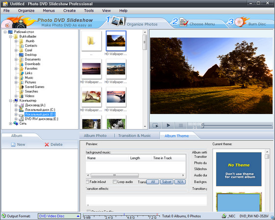 При помощи нескольких щелчков, программа создает потрясающие слайд-шоу фотографий с музыкальным сопровождением, CD или DVD меню, Pan&Zoom и эффектами перехода.