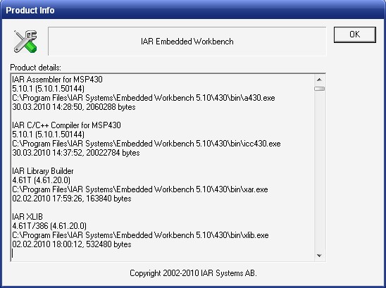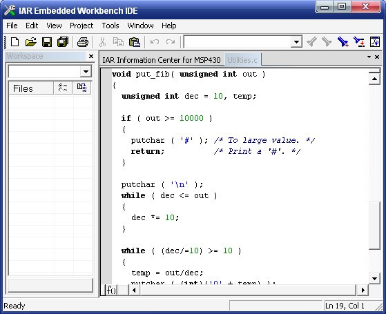 IAR Embedded Workbench for MSP430 - представляет собой мощную интегрированную среду разработки и отладки программ для микроконтроллеров MSP430 с помощу языка C, C++ и ассемблера. Она обеспечивает расширенную поддержку устройств MSP430 и создает очень компактный и эффективный код. В неё входят компилятор языка С и C++, ассемблера, компоновщик и отладчик, при этом возможно взаимодействие с внешними программами. Встроенный редактор специально настроен на синтаксис языка С, а дополнительные утилиты и хорошая встроенная система помощи дополнительно облегчают написание программ.