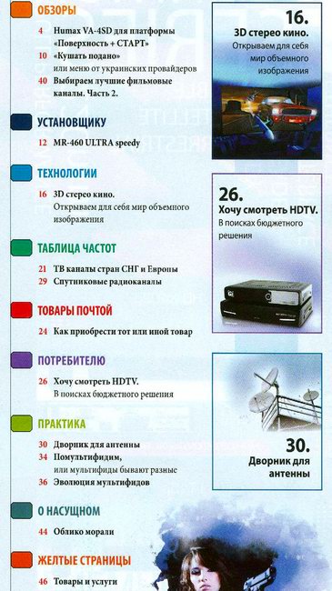 Целиком посвященный вопросам спутникового телевидения журнал. Рассматриваются свичи, DVB-карты, спутниковые антенны, комплекты для установки, модули и карты доступа, спутниковые ресиверы, усилители, а также каналы, их настройка, таблицы частот, различные нюансы, хитрости спутникового приема.