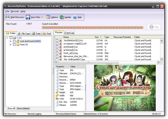 Recover My Photos – довольно полезная программа для восстановления графических файлов с цифровых носителей, которые были удаленны или просто потеряны по неосторожности. Поможет возвратить к жизни файлы с цифровых карт камер и других носителей. Recover My Photos быстро и легко восстановит все потерянные файлы. Для восстановления фотографий технической подготовки от вас не требуется, надо всего лишь сделать пару нажатий кнопки мыши и софт все сделает за вас. Recover My Photos восстанавливает потерю с Flash, Memory Stick, Smart Media и другие Медио носители, включая и потерю с жесткого диска.