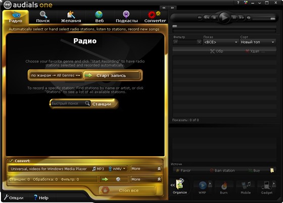 AudialsOne Platinum - это мощный комбайн для работы с видеосервисами и интернет-радио. Позволяет записывать фильмы которые вы смотрели по сети Интернет. Программа предоставляет вам возможность смотреть лучшие фильмы и Вам больше не придется беспокоиться о исчезновении их из интернет-магазинов видео. AudialsOne также может записывать клипы, захватывать простое и потоковое видео HD фильмов с видео-порталов и видео по запросу с веб-сайтов. Миллионы видео и аудио файлов теперь находятся в пределах вашей досягаемости.