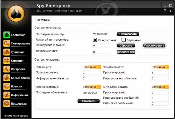 Spy Emergency - программа антишпион, которая быстро и безопасно находит и удаляет шпионские модули, рекламные программы и другие вредоносные программы из вашего компьютера. Вы боитесь хакеров или шпионских программ, тогда установите Spy Emergency и будьте уверены, что вы защищены от вмешательства в ваши личные дела, связанные с компьютером. Программа сканирует системную память, реестр, отдельные директории, файлы кукисов в поиске вредоносных программ и шпионских модулей. Утилита в реальном времени анализирует и защищает память компьютера. Также программа имеет поддержку интернет-браузеров Internet Explorer, Mozilla Firefox и Opera