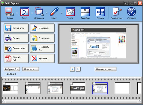 Solid Capture — многофункциональная программа для захвата изображений с экрана. Solid Capture позволит вам отсортировать сделанные снимки, выбрать из них нужные для редактирования, печати или отправки по почте. Кроме того, Solid Capture имеет следующие дополнительные инструменты: инструмент «Пипетка» для получения цвета пикселя; инструмент для изменения размера окна (напр., в 1024×768); инструмент «Линейка» и функция захвата текста. Solid Capture обладает интерфейсом на русском языке.