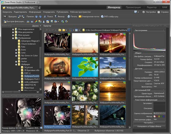 Zoner Photo Studio 12 является мощной программой для организации, просмотра, редактирования и публикации фотографий. Программа напоминает известный пакет ACDSee Pro Photo Manager, однако имеет значительно больше возможностей. При помощи данной программы также можно создавать DVD-альбомы, макеты календарей, онлайновые фотогалереи, трехмерные и панорамные снимки.