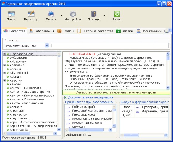 «Справочник лекарственных средств» содержит информацию почти по 14 тысячам лекарственных средств, включая синонимы названий. С помощью этой программы Вы без труда сможете найти лекарства необходимые для лечения указанного Вами заболевания. Все лекарства разнесены по фармакологическим группам. «Справочник лекарственных средств» предназначен для работы, как на персональном, так и на карманном компьютере.