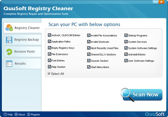 QuuSoft Registry Cleaner - утилита, предназначенная для чистки реестра операционных систем Windows, удаления ненужных и ошибочных записей, исправления проблем и т.д. Выполнение данных операций позволяет повысить быстродействие и стабильность работы ОС.