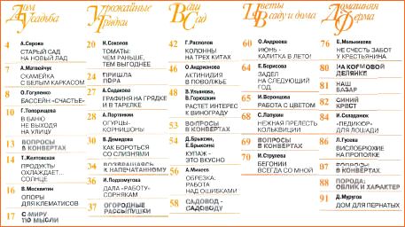 В номере: скамейка с белым каркасом, строим бассейн, оборудуем баню, о томатах, огурцах-корнишонах, клематисах, бегонии, актинидии, винограде, как всегда об обрезке, как бороться со слизнями, купаж - это вкусно, цветоводство, домашнее животноводство и многое другое - эти и другие темы нашли свое отражение в очередном номере журнала.