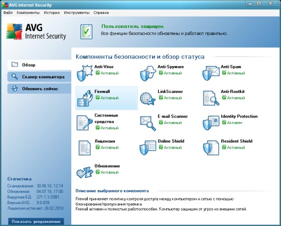 AVG Internet Security - комплекс программ для защиты ПК от опасных объектов и сетевых угроз. Программа блокирует вирусы, трояны, червей, шпионске программы, а фаервол защитит от возможных сетевых атак.