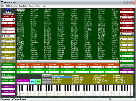 Эта программа разработана, чтобы быть столь же простой и настолько эффективной насколько возможно. Прямой пользовательский интерфейс позволяет Вам создавать регистрацию, используя клавиатуру Вашего компьютера или мышь. Другая большая особенность, введенная в версии 3, - то, что Вы в состоянии получить вход из внешнего источника как реальная клавиатура. Любой инструмент, который в состоянии послать сообщения MIDI, может быть включен в Ваш компьютер и управлял использующим Действительным Фортепьяно.