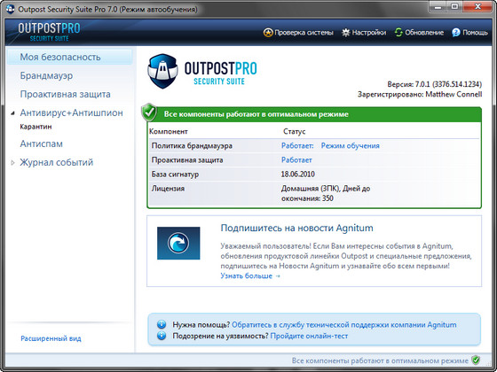 Вне зависимости от того, кто вы – новичок или эксперт в компьютерной безопасности, Outpost Security Suite Pro просто настраивается для ваших потребностей. Используйте встроенную помощь настолько, насколько вам это необходимо; автоматизируйте защиту настолько, насколько вам это необходимо; воспользуйтесь также преимуществом системы ImproveNet, вобравшую в себя опыт других пользователей. Интерфейс программы интуитивно ясен, так что какие бы вы настройки ни выбрали, вы получите требуемый вам уровень защиты.
