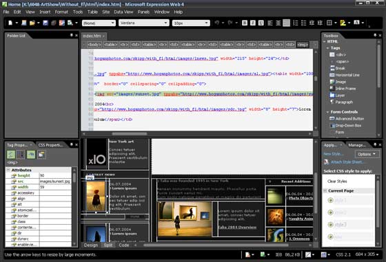 Expression Web - это визуальный HTML-редактор, пришедший на замену Microsoft FrontPage. Поддерживает PHP, HTML / XHTML, XML / XSLT, CSS, JavaScript, ASP.NET и ASP.NET AJAX, Silverlight, Flash, Windows Media и Photoshop, а также интеграцию с Microsoft Visual Studio. Теперь в Expression Web можно добавлять свои собственные компоненты – меню, панели инструментов, кнопки и даже диалоговые окна, используя только HTML, CSS, JavaScript и XML. Новые инструменты SEO-аналитики позволяют не только провести проверку повторяющихся или недостающих заголовков и мета-тегов, но также проверить содержимое на "чувствительность" к поиску, чтобы убедиться в том, что компоненты страницы не содержат общеприменимых значений.