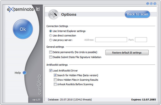 Exterminate It! - новая разработка в антивирусных системах. Если вы уже подверглись атаке. Вам срочно необходима помощь. Даже в случае постоянных обновлений ваших антишпионских программ, вы все равно не угонитесь за постоянно растущей базой троянов и другого вредоносного ПО. Приложение Exterminate It справляется с этой проблемой. Данная программа принадлежит последнему поколению malware сканеров. Вы получаете мощную программу по борьбе с вредоносным ПО, которая легко защитит ваш компьютер или ноутбук. Удаляет трояны, malware, программы — шпионы, adware, dialers, почти любой вид инфекции.