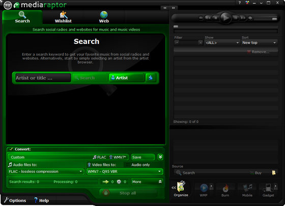 Mediaraptor является аудио и видео-поисковым инструментом, который позволяет найти, музыкальные треки и видео клипы из разных интернет-радиостанций и других источников. Вы можете осуществить поиск по названию или по имени исполнителя, найти новую музыку по жанру и автоматически записывать потоковое медиа во время поиска на YouTube, Google Video и других подобных сайтах. Другие функции включают комплексные средства конвертирования, редактирования ID3 тегов, записи файлов на CD диск и многое другое.