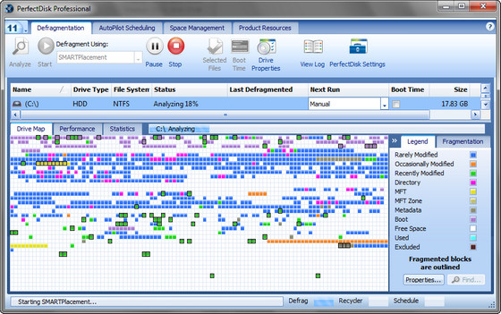 Данные в этой таблице отображаются в виде разноцветных квадратиков, расшифровку цвета которых можно посмотреть в главном окне PerfectDisk. Стоит отметить довольно быструю работу утилиты. Это связано с тем, что используется однопроходный метод дефрагментации с учётом S.M.A.R.T. данных винчестера. Может дефрагментировать не только локальные диски, но и с сетевые, причем в этом случае для облегчения настройки заданий используются профили сетевого планирования дефрагментации и полностью настраиваемое протоколирование работы. Поддерживаются работа с RAID-томами.