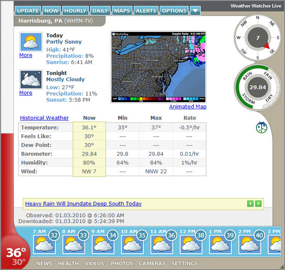 Weather Watcher Live – программа, представляющая собой портативную Windows–метеостанцию, работающую в реальном времени. Программа выполняет основные метеофункции, такие, как прогноз погоды на ближайший час, неделю, месяц. Также присутствует оповещатель, который предупредит вас о ближайших изменениях погоды. Программа имеет навигационную карту мира, в базе которой учтены тысячи городов по всему миру. Четко сбалансированный интерфейс позволяет управлять программой и получать всю нужную информацию несколькими нажатиями кнопок мыши. Уникальность программы проявляется еще и в том, что она создает обои, отображающие полную информацию в реальном времени о погоде в любом городе.