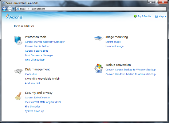 Acronis True Image - программа для полного резервного копирования, позволяющая создавать точные образы жесткого диска и/или отдельных разделов прямо в Windows без перезагрузки. Образ диска, включающий абсолютно все данные, приложения и операционные системы, может быть восстановлен на жесткий диск в случае сбоя старого диска, вирусной атаки и любых других фатальных ошибок программного и аппаратного обеспечения, даже когда обычные средства резервного копирования файлов не помогают.