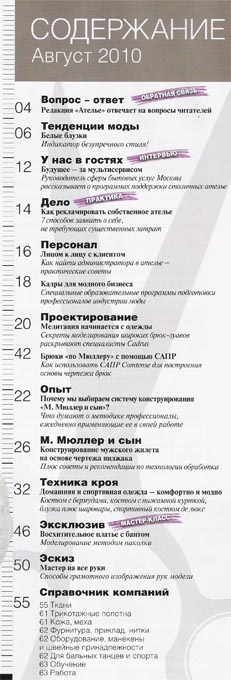 Журнал для тех, кто создаёт одежду. Основные материалы журнала посвящены последним новостям моды в России и за рубежом, персоналиям, так или иначе связанным с модой и производством одежды, производственным и техническим моментам в изготовлении одежды, тканям и методам их обработки, последним тенденциям в стиле и моде.