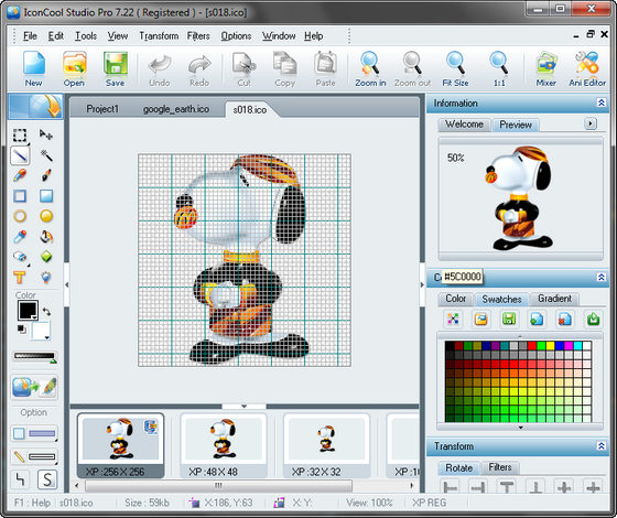 IconCool Studio - программа для создания и редактирования иконок. Утилита позволяет также импортировать и экспортировать иконки, содержит значительное число художественных инструментов для создания и редактирования иконок стандартных и специальных размеров. С помощью IconCool Studio можно создавать значки любых размеров, с глубиной цвета вплоть до 32bit True Color, создавать полупрозрачные иконки, экспортировать иконочные картинки в Photoshop, редактировать анимационные GIF файлы.