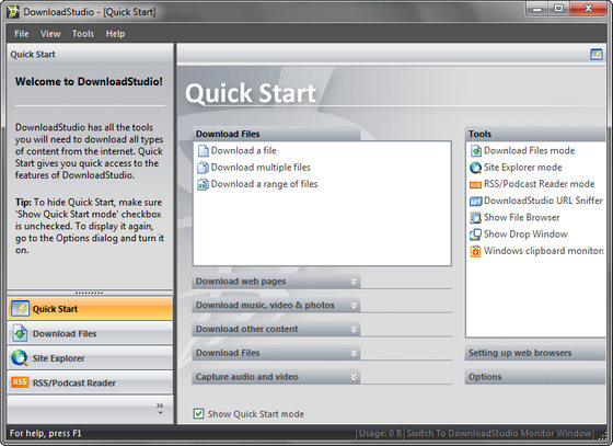 DownloadStudio - это универсальный комбайн для скачивания файлов и сайтов из Интернета. С ее помощью вы можете скачивать файлы в многопотоковом режиме, закачивать отдельные страницы или целые сайты для просмотра их в offline-режиме, а также осуществлять захват видеоизображения с экрана компьютера. Использование данной программы позволит вам отказаться от установки на компьютер программ, выполняющих все вышеперечисленные функции раздельно.