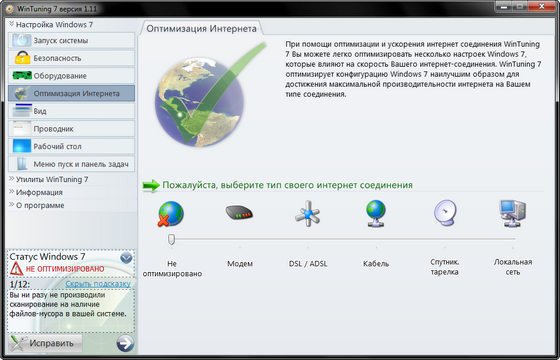 Программа WinTuning 7 предназначена для настройки и оптимизации Windows 7, улучшения её безопасности, удаления файлов-мусора с жесткого диска, уменьшения времени запуска компьютера и используемых программ. Позволяет настраивать загрузку и завершение работы компьютера, ядро системы, ускорять Интернет-соединение, редактировать скрытые настройки основных элементов Windows 7: рабочий стол, контекстные меню, проводник, панель задач, меню пуск и т.д. Для всех настроек есть текстовые подсказки, а для некоторых также отображается картинка, позволяющая просмотреть включенную настройку в действии.