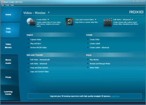 В новой версии пакета приложений появилась возможность конвертирования обычных фотографий и видеороликов в 3D-содержимое. Roxio Creator 2011 поддерживает 3D-форматы, которые используются в современных трехмерных фильмах, а также разнообразные устройства, предназначенные для работы с таким контентом. Пользователи программы могут импортировать стереоскопическое содержимое прямо из 3D-камер и других устройств захвата и затем создавать собственные 3D-проекты с эффектами перехода, титрами, фильтрами и звуковой дорожкой.
