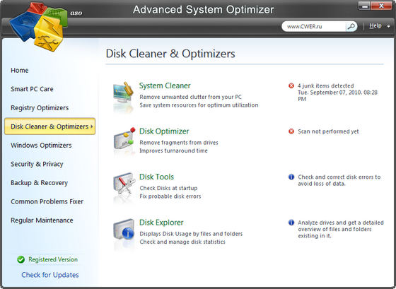 Advanced System Optimizer - программное решение для настройки и оптимизации работы вашей системы. Это легкий и самый лучший способ для сохранения производительности и безошибочной работы вашей системы. Программа содержит в себе более 30 различных инструментов для улучшения производительности и скорости работы вашей операционной системы. С помощью этой программы вы сможете чистить жесткий диск от ненужных файлов и различного мусора, проделывать чистку и дефрагментацию системного реестра, удалять конфиденциальные данные (кукисы, история сайтов, кеш и любые другие следы вашей активности), а также создавать резервную копию системных файлов и, при надобности, восстанавливать их.