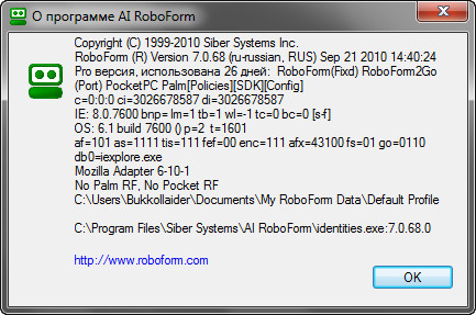AI Roboform Pro - программа, являющаяся менеджером паролей и заполнителем веб-форм, полностью автоматизирующей ввод паролей и заполнениe форм. С помощью этой программы персональные данные пользователя вводятся один раз и потом любая форма на любом сайте заполняется одним нажатием кнопки. Программой поддерживается заполнение форм на различных языках, в том числе и на русском. RoboForm может прочитать и заполнить любую форму, даже ту, которую он раньше не видел. Практически, данная программа делает то же самое, что и человек при заполнении формы - распознает, обрабатывает и заполняет форму. Программа устанавливается и работает в качестве плагина с браузерами Internet Explorer, Maxthon, Netscape, Mozilla, Firefox и обладает многоязычным интерфейсом с поддержкой русского языка.