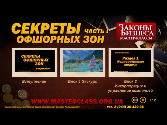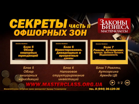 Видеокурс основан на известном в Украине мастер-классе "Секреты офшорных зон", автором и ведущим которого является адвокат Эдуард Голодницкий, налоговый консультант в сфере международного налогового планирования и структурирования финансовых транзакций. За последние три года данный мастер-класс посетили более 4000 бизнесменов, топ-менеджеров, юристов и аудиторов. И теперь предлагается профессиональная видеозапись мастер-класса на подобную тематику.
