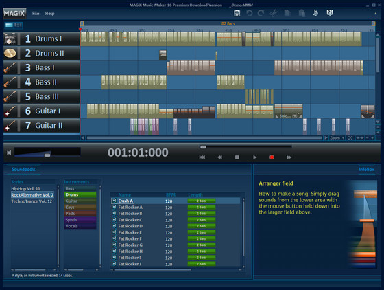 MAGIX Music Maker 16 Premium — программа представляет собой одно из лучших решений для создания музыки. Этот уникальный пакет включает MIDI-клавиатуру и полу-профессиональные программы для создания музыки. Она идеально подходит для создания песен, экспериментальной музыки и захватывающих саундтреков. В версии Premium предоставлены дополнительные возможности, больше звуков, эффектов и функций. Программа предоставляет вам высококачественные премиум образцы, виртуальные инструменты, MIDI петли, комплекс микшерного пульта и эксклюзивные эффекты.