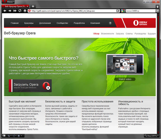 Opera — один из самых быстрых и гибких в настройке браузеров. Используя скины, пользовательские панели и другие средства настройки интерфейса, его внешний вид можно изменять до неузнаваемости. Программа позволяет «на лету» отключать и включать графику, а также может похвастаться фирменной технологией масштабирования веб-страниц, благодаря которой пользователи браузера практически никогда не видят горизонтальной прокрутки.