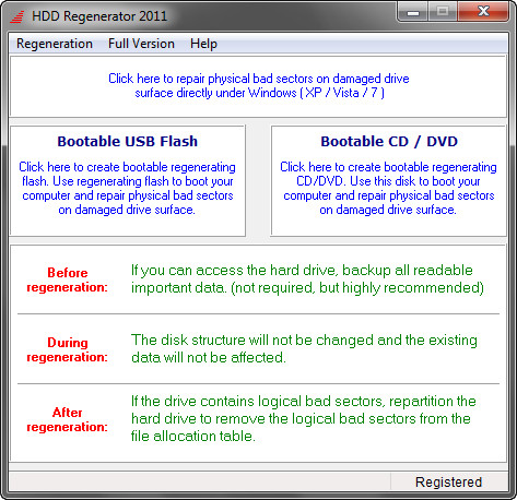 - Bootable regenerating flash can be created from the program and used to automatically start regenerating process