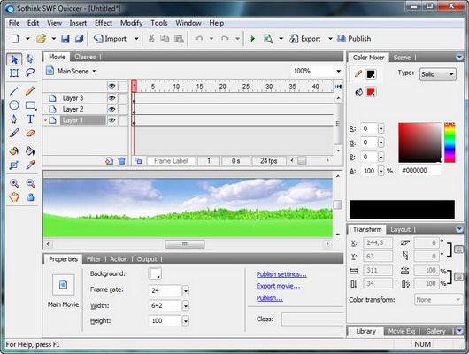 Редактор программы предоставляет возможности для редактирования всех элементов во флэш-видео, например, добавление или изменение текста, замена форм или звуков, назначение ссылок и т.д. К каждому объекту флэш-сцены вы сможете применить встроенные в программу эффекты перехода или появления объекта. Возможно, для вас эта программа сможет стать заменой приложению Adobe Flash, т.к. обладает простым и легким в понимании и использовании интерфейсом.