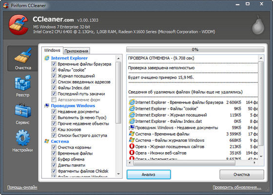 CCleaner, в зависимости от настроек, чистит следующие компоненты Windows: