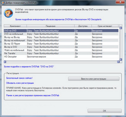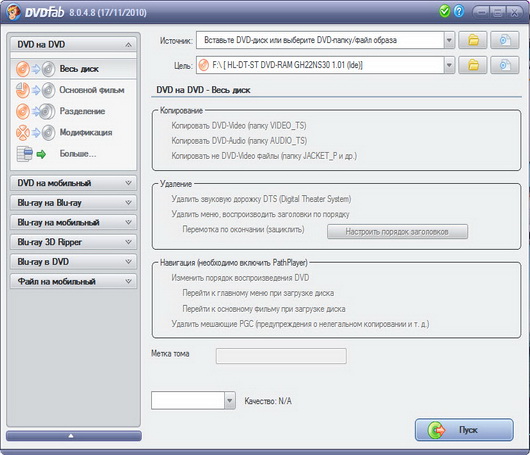 DVDFab – мощный, многофункциональный программный продукт для копирования DVD дисков с возможностями гибкой обработки видеопотока. Программа является одной из лучших на сегодняшний день, из инструментов для копирования, разбиения, пережатия и конвертирования DVD дисков с фильмами. Снимает все защиты и ограничения с диска и при желании пережмет диск большой емкости и вместит его в обыкновенную пустую DVD болванку с минимальными потерями качества (DVD9->DVD5) или разобьет фильм на два диска с полным переносом его меню, удалит всю рекламу, запишет только фильм и многое другое. Программа имеет интуитивно понятный, мультиязычный интерфейс включая русский.